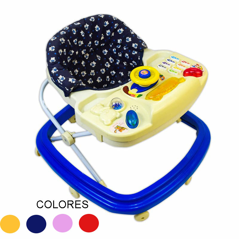 Andadera semi-lujo, tablero musical con luz, volante, teclas de colores, charola con porta biberón, asiento acojinado, de 8 llantas giratorias, varias posiciones.