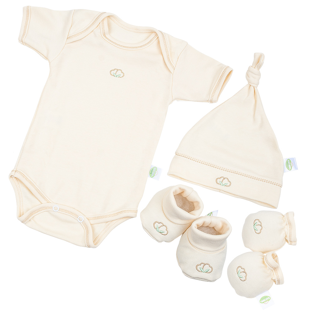 Set para recién nacido elaborado con fibras de algodón orgánico, incluye: 1 pañalero, 1 gorro, 1 par de manoplas y 1 par de zapatos.