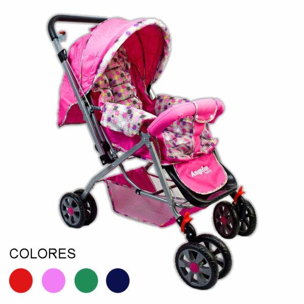 Carriola con mango reversible, respaldo acojinado reclinable de 3 posiciones, plegable, llantas delanteras giratorias con fijador, freno trasero, canastilla, descansa pies, capote con ventana y porta accesorios.