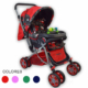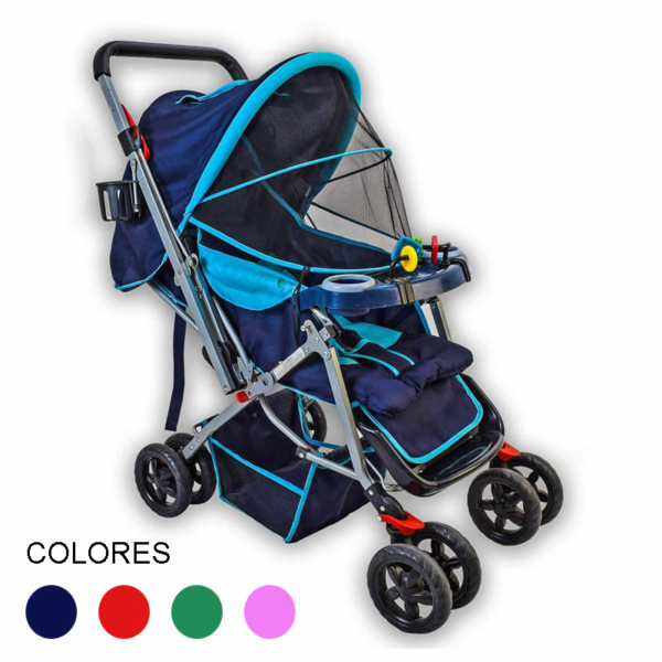Carriola con mango reversible, respaldo acojinado reclinable de 3 posiciones, llantas delanteras giratorias, freno trasero, charola con juguetero, canastilla, descansa pies, capote completo con mosquitero plegable con ventana y porta biberón.